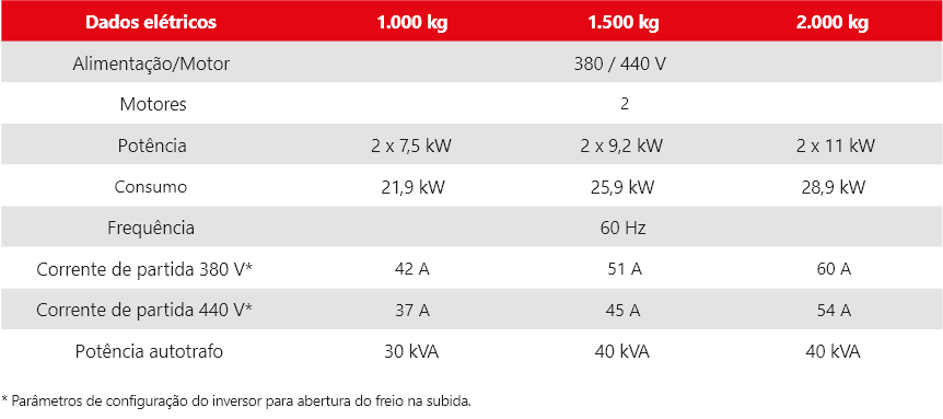 Alimentação dos motores em 380/440V. Em caso de obras com alimentação 220V trifásica, acompanha autotrafo com a saída 380/440V.